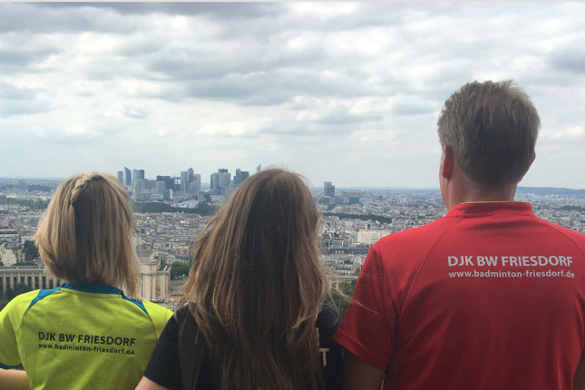 (F.O) Das Friesdorf Trikot hat jetzt Paris erreicht und den Eiffelturm erklommen. Hier seht ihr Lea, Maria und Micha vor und auf dem Eiffelturm.