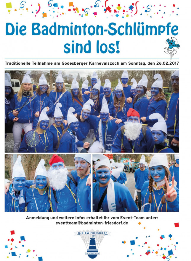 (F.O) Wie auch im letzten Jahr werden wir als blau weisse Schlümpfe mitgehen. Wenn ihr wieder oder zum ersten Mal dabei sein möchtet, meldet sich euch noch ganz schnell an. Der Unkostenbeitrag beträgt dieses Mal 25€ für Jugendliche und 35€ für Erwachsene.