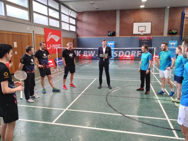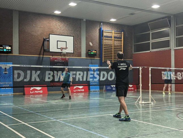 Ziemlich zeitgleich ging es mit den anderen beiden Herreneinzeln weiter. Im 1.HE mit Florian B. und Fabi im 2.HE kämpften sie um die weiteren Punkte für Friesdorf. Die ersten Sätze wurden von beiden knapp verloren. Aber dann haben sie sich nochmal zusammengerissen und holten sich jeweils den zweiten Satz. In einem nervenraubenden dritten Satz holten sich beide schließlich den Sieg und damit weitere zwei Punkte für Friesdorf! (1.HE: 17-21; 21-14; 21-18 || 2.HE: 19-21; 21-15; 21-17)